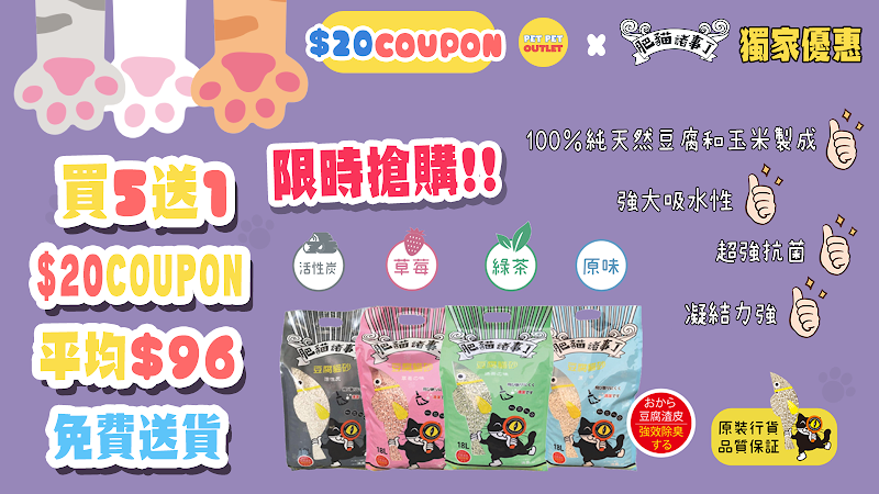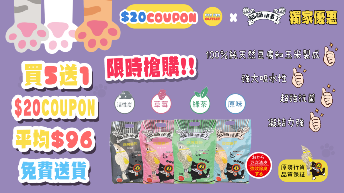 現凡登記成為 Pet Pet Outlet 會員, 即可享有HoneyCare 寵物尿墊 $20 電子現金卷, 即買即用!肥貓諸事丁豆腐貓砂65折!仲有更多精彩優惠等緊你!